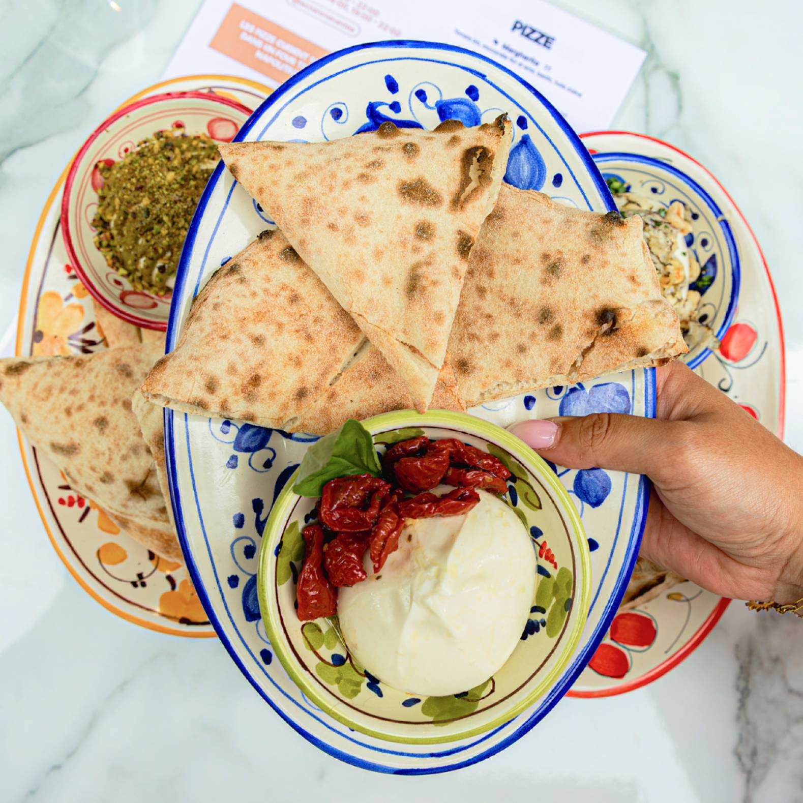 Crème ricotta, mozzarella fior di latte, mortadelle pistache IGP, pesto de pistaches maison, pistaches, stracciatella